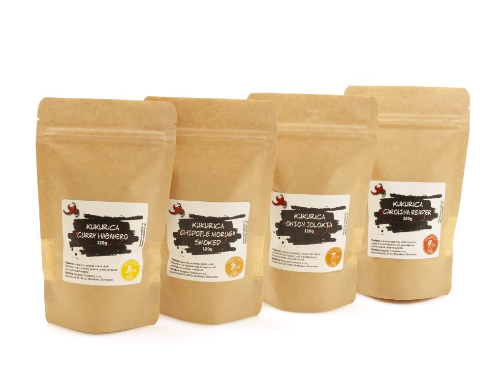 Pálivost: obalené v Trinidad Moruga Scropion (až do 2.000.000 SHU) a Chipotle (až do 5.000 SHU)