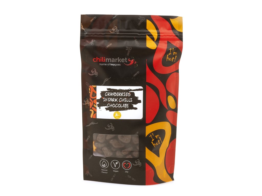 Složení: brusinky 43%, hořká čokoláda 54%, kakaová hmota, cukr, kakaové máslo, emulgátor: sójový lecitin; aroma: přírodní vanilka; Chilli: Moruga Scorpion, konzervant E202